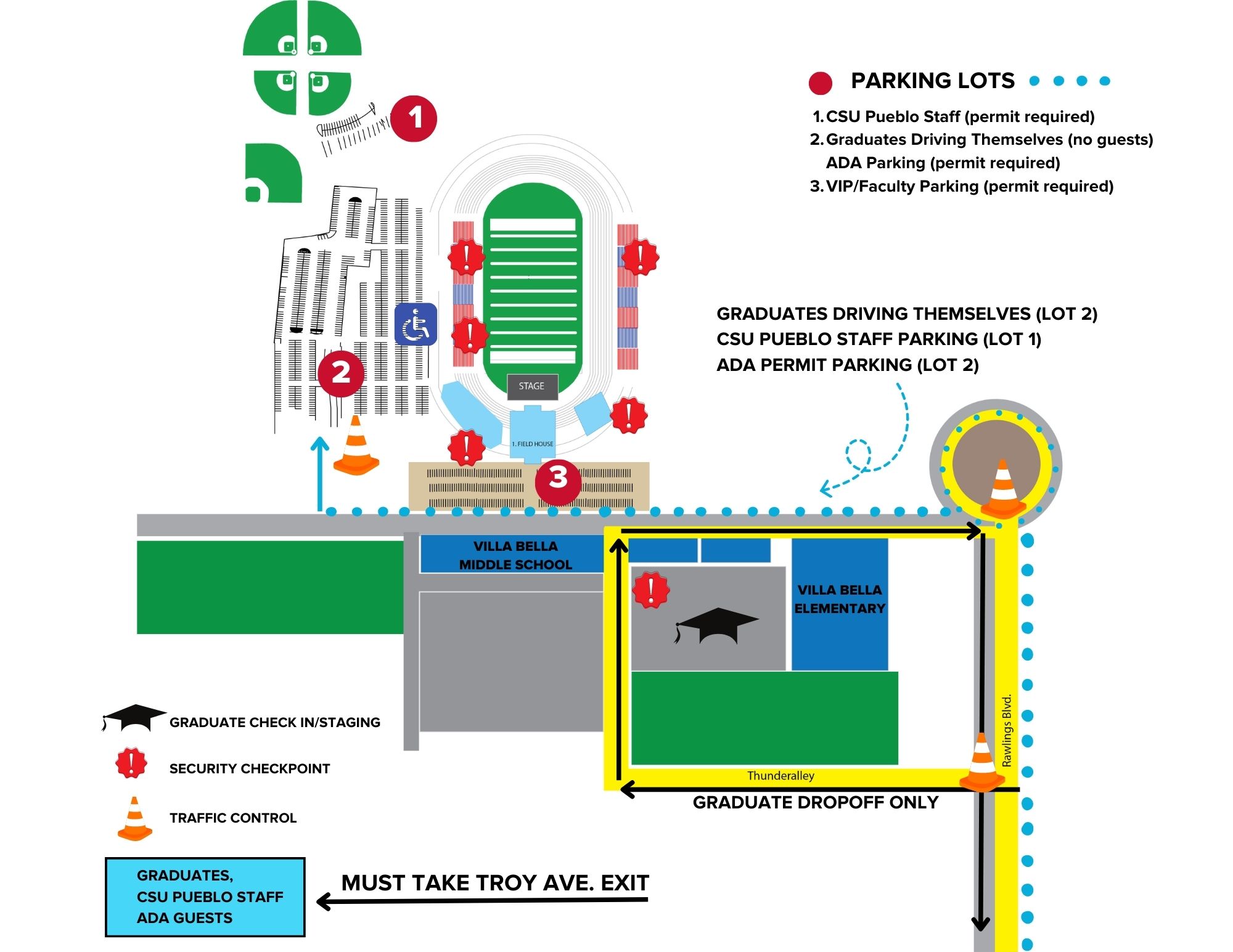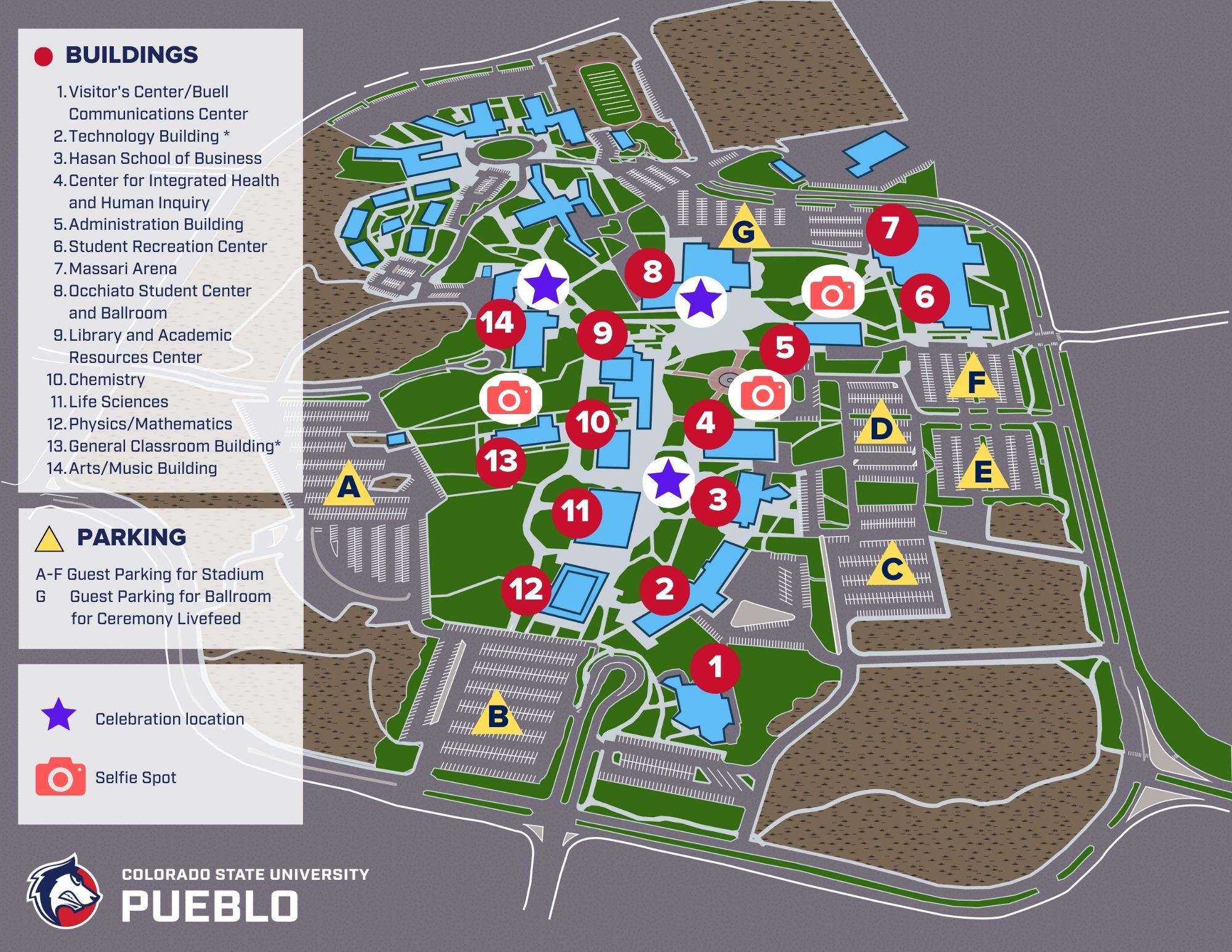 Guests not dropping off a graduate should take the Bonforte entrance to CSU Pueblo and may park in any of the lots indicated on the attached map.Wheelchair-accessible shuttles will be available to take guests to stadium.