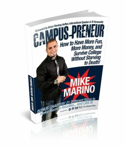 In his new book, Campus-Preneur: How to Have More Fun, More Money, and Survive College Without Starving To Death, Marino outlines the path he took that transformed his life from a suicidal teenager with no hope for the future into one of the hottest youth speakers in America today. A recent article on CBS Money Watch stated that 73 percent of college seniors were looking for work, while 46 percent of graduates in the past two years say they are underemployed and working in jobs that do not require their college degrees.