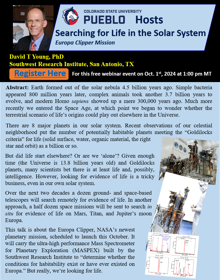Pueblo, COLO – Colorado State University Pueblo (CSU Pueblo), a Hispanic-Serving Institution (HSI), is demonstrating its commitment to advancing space exploration by hosting a free webinar on the search for life in our solar system. The event, titled "Searching for Life in the Solar System: Europa Clipper Mission," will take place on October 1st, 2024 at 1:00 PM MT.
