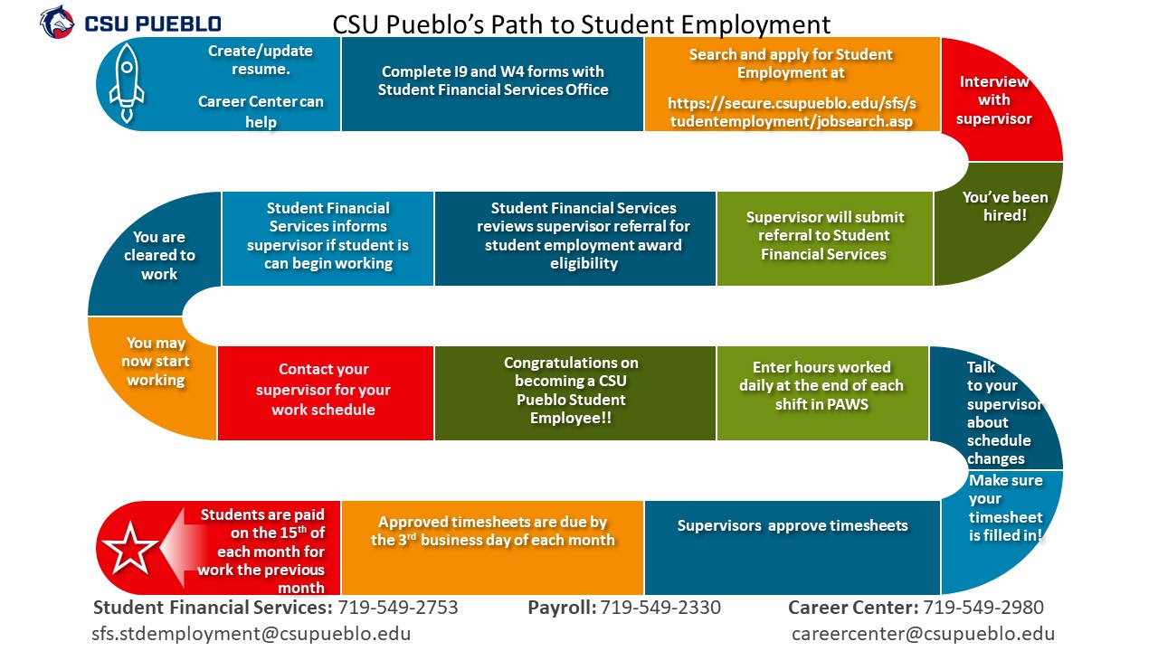 In addition to the student employment programs above, the CSU Pueblo Career Center offers employment services to current students and alumni from the University. They assist students with professional employment, internships, career planning, and career coaching.